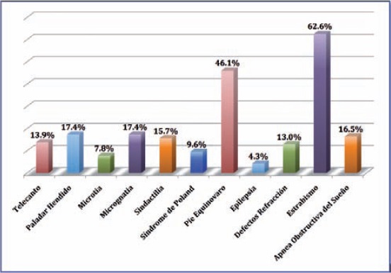 –Musculoesqueléticas. Un total de 53 pacientes (46.1%) presentaron pie equino varo, siendo esta la patología de extremidades más frecuente; 18 (15.7%) tenian algún grado de sindactilia; y 11 (9.6%) síndrome de Poland asociado. En este grupo de pacientes solo se reportó 1 caso de escoliosis tóraco-lumbar, 1 caso de agenesia de pie derecho y 1 caso de mano hendida atípica bilateral.
