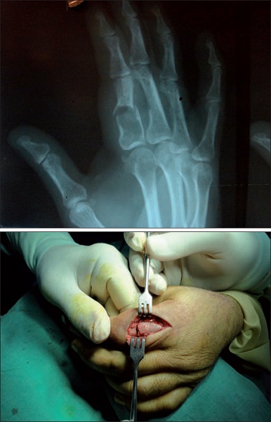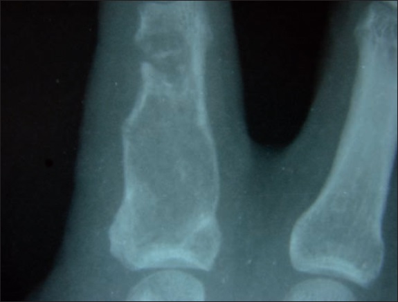 Varón de 56 años de edad que acude a consulta con un inmovilizador de mano. Tenía antecedente de tumoración de falange proximal del segundo dedo de la mano izquierda, no dominante, que había sido tratada de forma conservadora por un médico ortopeda durante 3 años sin justificación terapéutica alguna (Fig. 1). La tumoración presentaba en ese momento unas dimensiones de aproximadamente 38 x 20 mm de diámetro mayor longitudinal, que afectaba prácticamente a las tres cuartas partes de falange. El crecimiento había sido gradual hasta que se produjo una fractura patológica durante un esfuerzo menor de prensión, la cual fue confirmada por radiografía simple. Dado que se trataba de una fractura patológica, que no podía curar por el problema de base, programamos al paciente para intervención quirúrgica planificada (Fig. 2).