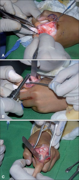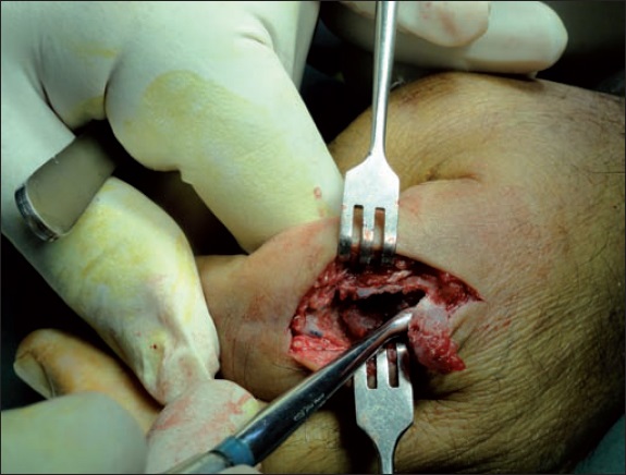 Realizamos el abordaje quirúrgico del encondroma digital sobre el aspecto dorsal de la falange afectada, siguiendo un diseño individualizado para cada paciente que permita preservar las venas de drenaje con el fin de evitar la congestión venosa distal en el área quirúrgica; tenemos la misma consideración para la circulación arterial circunfleja periarticular. Continuamos con disección subperióstica de acuerdo a la región afectada por el tumor, con liberación amplia del aparato extensor dorsal. La resección tumoral, planificada de acuerdo con las imágenes diagnósticas, la llevamos a cabo de manera muy precisa con sierra neumática oscilatoria y gubia fina, preservando, cuando las condiciones encontradas lo permiten, un remanente de cortical palmar sin compromiso tumoral macroscópico para orientación del injerto óseo a emplear en la reconstrucción ulterior de la falange, y preservando el mecanismo de los tendones flexores y extensores no afectados por la lesión tumoral. Proseguimos con un curetaje exhaustivo de la cavidad, retirando todo el tejido mixoide tumoral hasta encontrar cortical de aspecto macroscópico aparentemente no comprometido.
