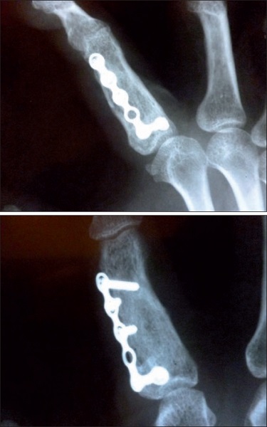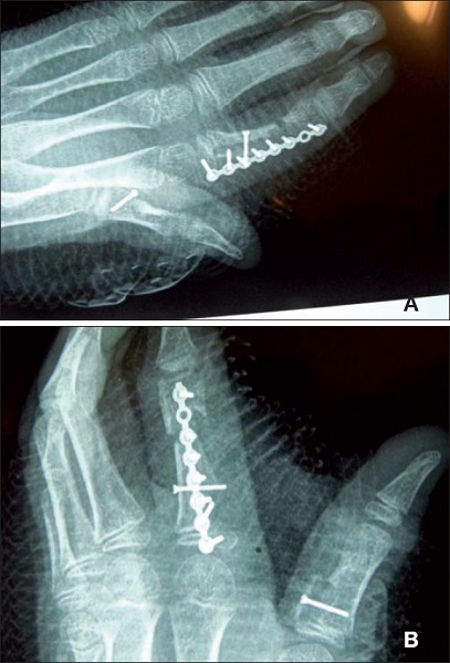 Para la obtención del injerto óseo de hueso ilíaco empleamos infiltración local de solución anestésica vasoconstrictora con bloqueo proximal de inervación periférica sensitiva. Conseguimos la osteosíntesis con una placa de mano de titanio en forma de L de 6 orificios y 5 tornillos que proporcionó la estabilidad necesaria entre los 3 elementos óseos: remanente óseo proximal, injerto óseo interpuesto y remanente óseo distal, obteniendo así una reconstrucción anatómica de la falange proximal.