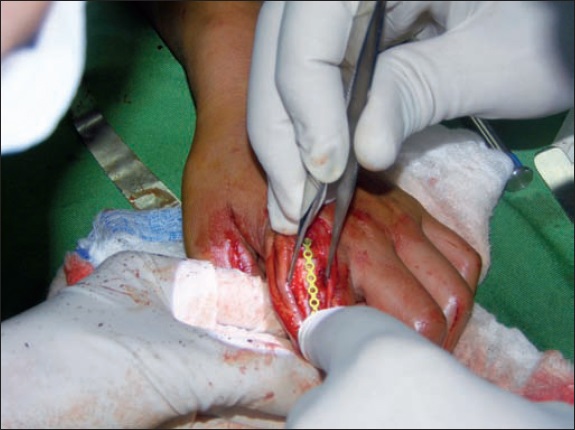 Finalmente examinamos la funcionalidad del dedo afectado y procedemos a reconstruir adecuadamente los ligamentos de estabilidad articular. Reparamos la incisión de abordaje en dos planos de sutura. En el postoperatorio inmediato mantenemos la mano en posición elevada durante 5 días antes de iniciar la movilización gradual pasiva y activa de flexión y extensión de las articulaciones metacarpo-falángica e interfalángica proximal. Conseguimos de esta forma una recuperación funcional suficiente antes de los 2 meses de postoperatorio.
