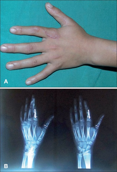 Dado que el paciente estaba en etapa de crecimiento, en un segundo tiempo quirúrgico, a los 15 meses de post-operatorio y una vez comprobada tanto clínica como radiológicamente la integración del injerto óseo que proveía suficiente estabilidad, decidimos retirar el tornillo de la epífisis porque frenaba la posibilidad de crecimiento de la falange. A pesar de una discreta angulación radial del dedo, que no pudimos corregir, la funcionalidad a los 2 meses de postoperatorio resultó ser suficientemente satisfactoria y el paciente precisó de poco tiempo para su rehabilitación. El seguimiento a los 2 años sigue siendo también satisfactorio y sin recidivas (Fig. 10).