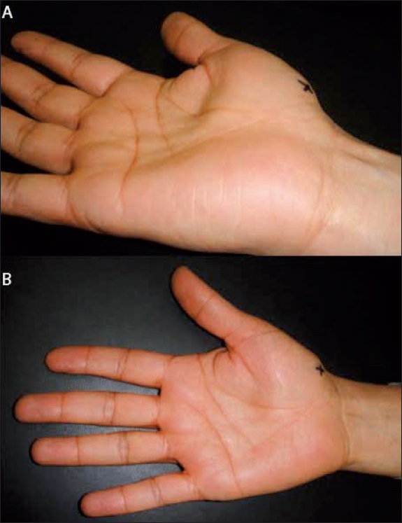 Al examen físico (Fig. 1) palpamos masa de consistencia blanda de aproximadamente 3 cm de diámetro, no adherida a planos profundos, móvil en el plano transversal, y con signo de Tinnel positivo a la percusión del nervio mediano en su paso por el túnel del carpo.