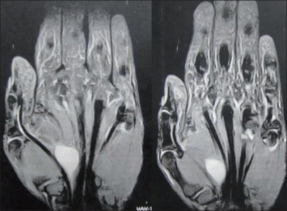La radiografía de mano y la electromiografía presentaron parámetros normales. La RNM informó de masa bien definida con densidad de tejidos blandos en mano derecha, hipointensa en T1, que en su trayecto se encuentra en contacto con el nervio mediano, con dimensiones de 2.2 cm en sentido anteroposterior, 3.1 cm en sentido mediolateral, y 2.6 cm en sentido cefalocaudal (Fig. 2).