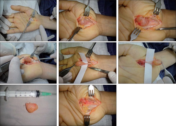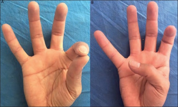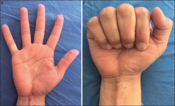 En el postoperatorio mantuvimos inmovilización con férula durante los primeros 7 días e instauramos tratamiento analgésico. Posteriormente dejamos al paciente sin inmovilización, y presentó parestesias y dolor sobre el territorio del nervio mediano al mes de postoperatorio, por lo que se decidimos iniciar terapia de desensibilización nerviosa que logró mejoría progresiva durante los primeros 6 meses y respuesta completa clínica a los 12 meses de la intervención. Funcionalmente el paciente pudo reincorporarse a su actividad habitual al año de post-