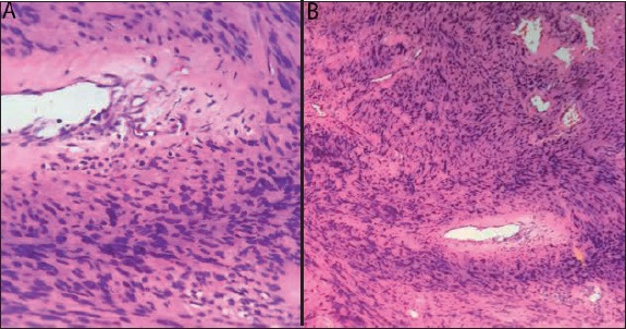 El estudio histopatológico sobre el espécimen resecado aportó diagnóstico definitivo de schwannoma, evidenciando un doble patrón histológico con las llamadas áreas de Antoni A de densa celularidad con células fusiformes, y de Antoni B como zonas hipocelulares con matriz laxa y vasos sanguíneos contiguos prominentes (Fig. 4).