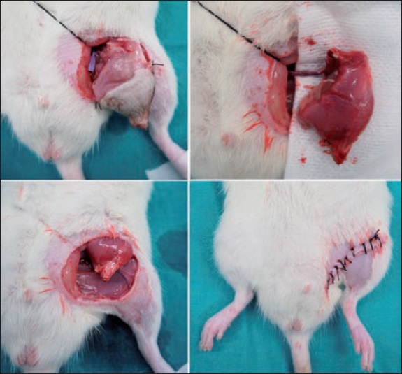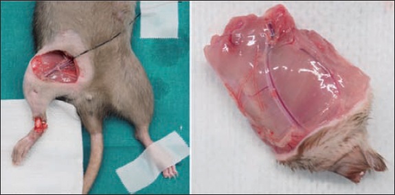 El aloinjerto se extrajo a nivel de la raíz de la pata posterior de la rata, tomando los vasos femorales como pedículo (Fig. 1).