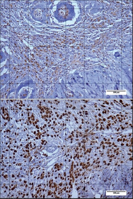 Escogimos 5 cortes aleatorios por aloinjerto y muestreamos 2 áreas de 90000 μm2 por corte, con una magnificación de x200. Consideramos positivas para el contaje aquellas células que mostraban núcleo y citoplasma. El muestreo se llevó a cabo por 2 observadores independientes (Fig. 4).