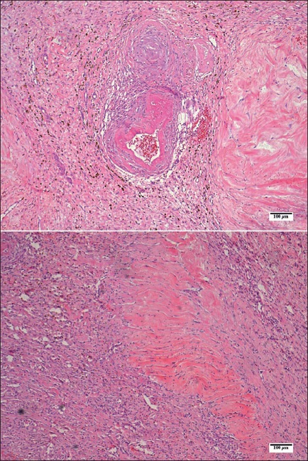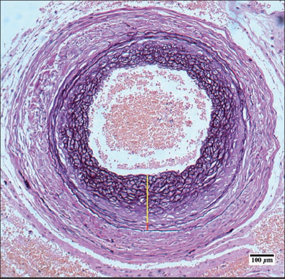 Para ello preparamos 5 cortes histológicos aleatorios de cada segmento vascular a estudiar, y valoramos tras tinción con el kit de tinción de fibras elásticas según van Gieson (Merck KGaA, Darmstadt, Alemania). Los resultados mostraron los núcleos celulares de color pardo negruzco, las fibras elásticas en negro, el colágeno en rojo y la musculatura en amarillo.