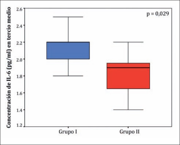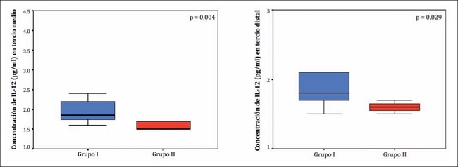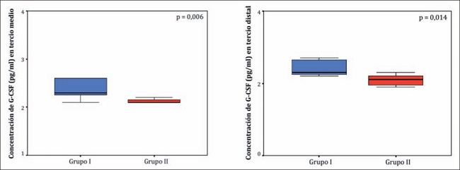 Las concentraciones de citoquinas con diferencias significativas a nivel del tercio medio y distal del aloinjerto están representadas en diagrama Box-Plot en las Fig. 7-9.