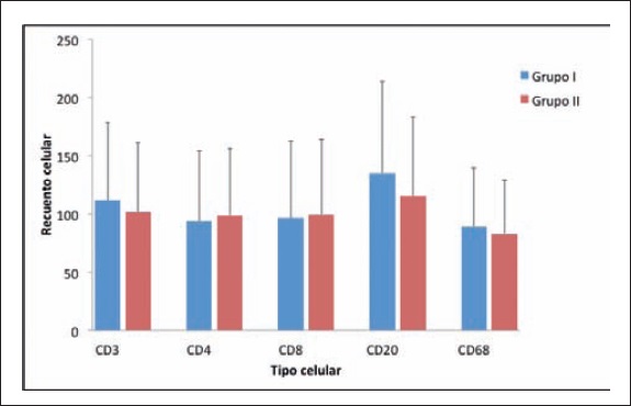 –Cuantitativa. Los resultados de los contajes celulares en el tercio medio del aloinjerto por área media de 90000 μm2 con una magnificación de ×200 para los estudios IHQ frente a los antígenos CD3, CD4, CD8, CD20 y CD68 están representados en la Fig. 11. No encontramos diferencias significativas entre ambos grupos.