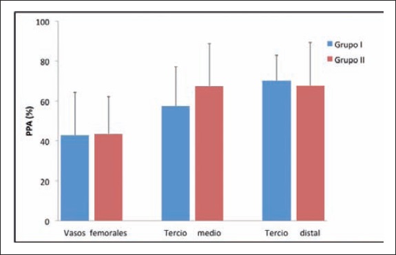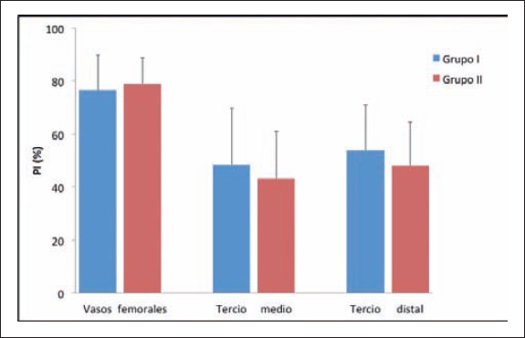 Todas las muestras estudiadas presentaron signos histopatológicos de RC. Los resultados de cada una de las muestras a nivel de los vasos femorales y de los vasos del tercio medio y distal del aloinjerto expresados como PI y PPA están representados en las Fig. 12 y 13. No encontramos diferencias significativas entre ambos grupos.