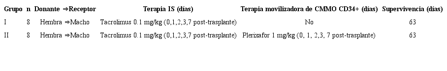 Los animales receptores del grupo II recibieron terapia movilizadora de CMMO CD34+ con plerixafor (Mozobil®, Genzyme, Cambridge, Massachusetts, EE.UU.) a dosis de 1 mg/kg/24 horas por vía subcutánea los días 0, 1, 2, 3 y 7 post-trasplante.(10)