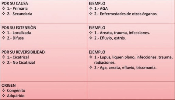 Las alopecias tienen diferentes presentaciones clínicas que se pueden clasificar en cicatrizales y no cicatrizales (Tabla I). Las cicatrizales son aquellas en las que el cabello, una vez perdido, ya no se recupera existiendo un daño hereditario o adquirido del folículo piloso, que puede ser debido a una enfermedad propia del folículo o independiente de él,(3) destacando en este grupo el lupus eritematoso sistémico, el liquen plano, las infecciones, radiaciones, traumatismos, etc. Por el contrario, en las alopecias no cicatrizales, la pérdida es habitualmente difusa y reversible, manteniéndose la integridad del folículo piloso. Las causas más frecuentes son la alopecia androgenética (en fases iniciales), la alopecia areata, los efluvios, la dermatitis seborreica, la tricomanía, avitaminosis o hipervitaminosis, malnutrición, estrés o mal-absorción por traumatismo en general, y enfermedades endocrinas como hipo o hipertiroidismo etc.(4)