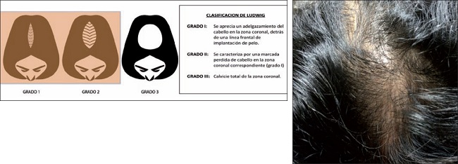 Para nuestro propósito, diseñamos un estudio clínico experimental, prospectivo y longitudinal de seguimiento de casos. De la muestra de 261 pacientes seleccionamos 19 mujeres y 242 varones, con un rango de edad de entre 20 y 57 años (media de 38.5 años), según la clasificación de Hamilton – Norwood para AGA masculina del grado I al IV (Fig. 1) y la escala de Ludwig para AGA en mujeres entre grado I al II (Fig. 2), incluyendo en el estudio los casos con efluvio telogeno (Fig. 3) en ambos sexos diagnosticados por historia clínica y tricograma.