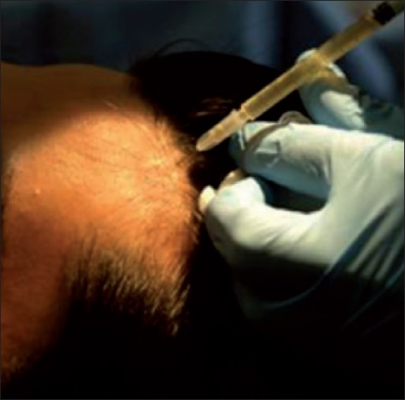 La aplicación sobre la zona a tratar la hicimos mediante inyección intradérmica en cantidades de 0.05 ml aproximadamente por punto de aplicación (cada 1 cm2 como perímetro de la zona a tratar) aplicando entre 160 y 200 punciones en total antes de que el contenido de la jeringa gelifique como consecuencia de la activación del proceso de coagulación.