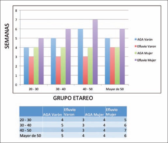 La respuesta de los varones, en cuanto a velocidad de respuesta del organismo fue más rápida, con una media de 10.1 semanas a diferencia de las mujeres con 11.5 de promedio, independientemente de la patología. Al igual que con la primera variable (tiempo para evaluar la disminución de la caída de cabello), el grupo etario que respondió mejor en esta etapa fue el comprendido entre los 20 y 30 años de edad, seguido por el segundo grupo de edad. El que tomó más tiempo fue el grupo mayor de 50 años de edad. El tiempo de crecimiento del cabello sano en las zonas tratadas tuvo un promedio de 10.8 semanas.