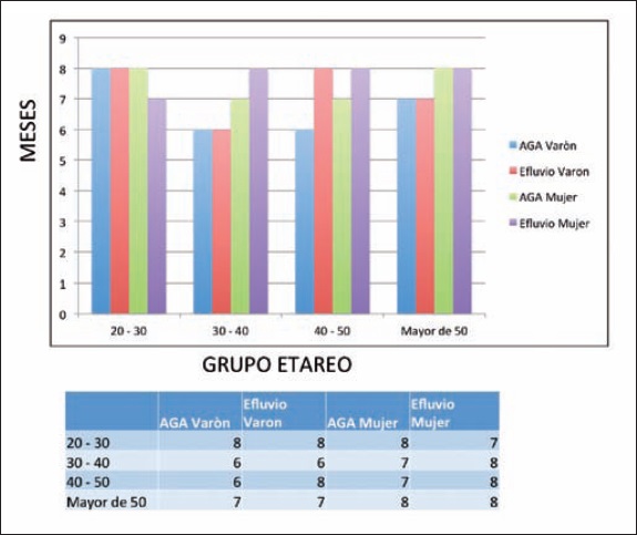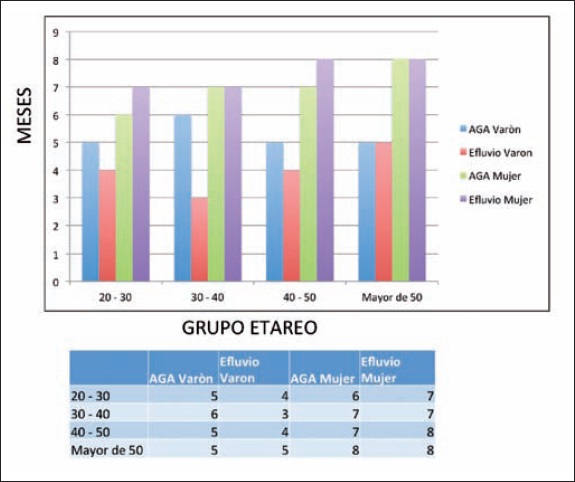 Observamos que la densidad de cabello que evolucionó más rápido fue en el efluvio en varones, con un promedio de 4 meses, seguida de la AGA en varones con 5.25 meses de promedio. En tercer lugar tenemos a la AGA en mujeres con 7 meses, y finalmente el efluvio en mujeres con 7.5 meses. El tiempo de crecimiento del cabello traducido en mayor densidad capilar se dio con una media de 5.9 meses, presentando una respuesta promedio en la que predominó el grupo de varones con una media de 4.6 meses a diferencia de las mujeres con 7.25 meses de promedio, independientemente de la patología en cuanto a velocidad de respuesta del organismo. El grupo etario que respondió mejor en esta etapa fue el comprendido entre los 20 y 30 años de edad seguido por el segundo grupo de edad. Los que necesitaron más tiempo fueron los 2 últimos grupos.