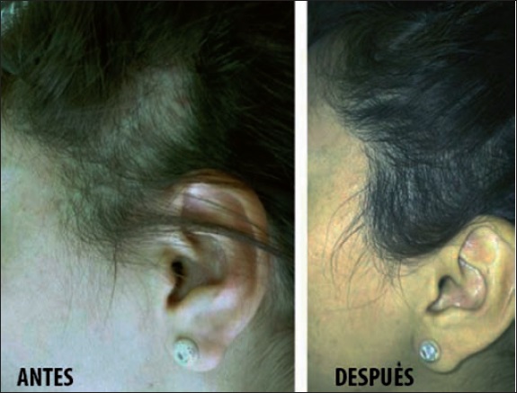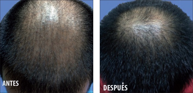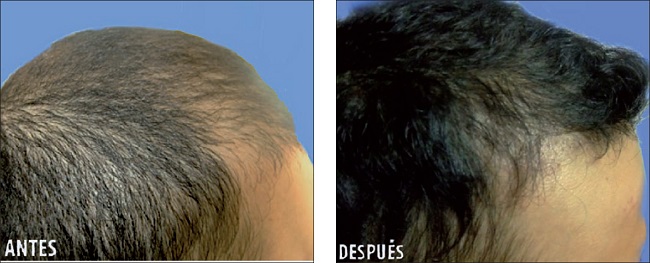 Resultados: Observamos en promedio que la disminución de la caída de cabello se dio a las 4.56 semanas, la evidencia de crecimiento de cabello a las 10.8 semanas. El aumento de la densidad fue evidente en varones a los 4.6 meses y en mujeres a los 7.25 meses. Para la medición de satisfacción utilizamos escala visual análoga del 1 al 10, con un resultado promedio de 7.6 en mujeres y 7 en varones. No hubo casos sin respuesta positiva al tratamiento ni fracasos.