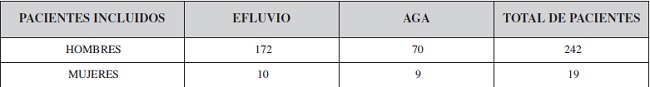 Seleccionamos un total de 320 pacientes que acudieron a consulta por alopecia, 59 de los cuales fueron excluidos al no cumplir los criterios de inclusión del presente estudio o abandonaron por ausencia de controles. (Tabla II).