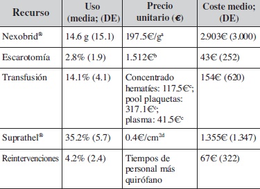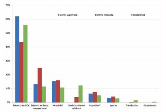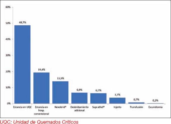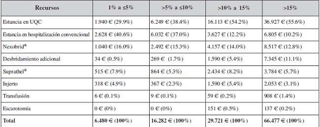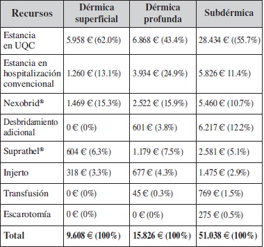 Methods: We analyzed retrospectively the resources used in the treat-ment by enzymatic debridement with Nexobrid® of wounds by thermal burn of superficial/deep partial and full-thickness, of the adult patients admitted consecutively in our hospital (2014-2016). Participation of each resource in total cost was analyzed for some patient subgroups.