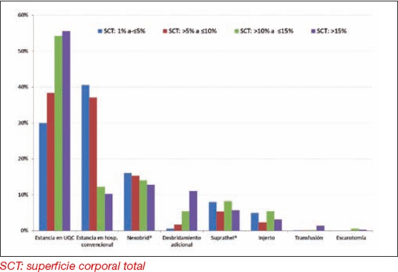El estudio de costes identificó y cuantificó los recursos relevantes utilizados en el procedimiento con cada paciente desde el desbridamiento enzimático hasta el alta; por ello, la perspectiva utilizada en el estudio fue la del centro hospitalario. Una vez identificados los recursos utilizados, asignamos un precio unitario a cada recurso. Los costes incluidos en el estudio fueron sólo de tipo sanitario directo, generados por el sistema sanitario para el tratamiento directo de las quemaduras (Nexobrid®, escarotomías, transfusiones, uso de Suprathel®, reintervenciones, injertos, desbridamiento adicional, estancia en la Unidad de Quemados Críticos y en hospitalización convencional); no incluyeron los costes indirectos (asociados a la reducción de productividad laboral) dada la perspectiva adoptada del hospital. Calculamos el coste de cada paciente multiplicando el uso de cada recurso utilizado por su precio unitario. ( 10) Estimamos el precio unitario de cada recurso a partir de su coste de adquisición o mediante el valor medio de los precios públicos de servicios sanitarios de distintas Comunidades Autónomas del territorio nacional. ( 11) Finalmente, analizamos las variaciones del coste medio en función de la profundidad y la SCT de la profundidad de la quemadura. Expresamos todos los costes en euros (€) correspondientes a 2017.