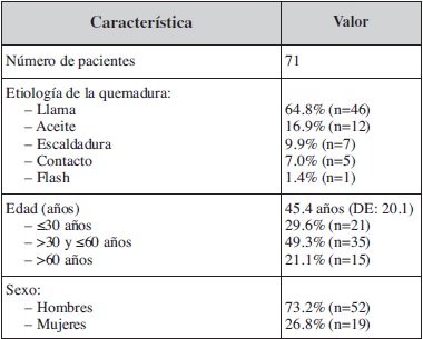 El estudio incluyó a 71 de los 75 pacientes que ingresaron en el hospital. Edad media: 45.4 años; hombres: 73.2%; herida por llama: 64.8%; quemadura dérmica profunda: 77.5%; SCT media: 8.5%; SCT ≤10%: 70.4% ( Tabla I).