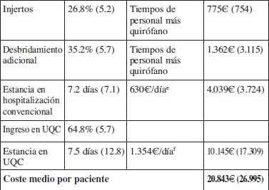 El coste medio estimado por paciente fue de 20.844€ (rango: 2.192-145.198) ( Tabla II); la estancia en la Unidad de Cuidados Intensivos (UCI) y en la Unidad de Quemados fueron los componentes más importantes del coste total, constituyendo el 68,1% del mismo, mientras que Nexobrid® contribuyó sólo con el 13.9% ( Fig. 1).