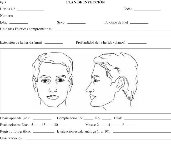 Para registrar la información recopilada diseñamos un instrumento de recolección de datos tipo ficha de registro que denominamos Plan de inyección, donde incluimos nombre, sexo, edad, fototipo de piel, unidades estéticas comprometidas, extensión de la herida (medida en cm de longitud), profundidad de la herida (valorada según planos de tejido comprometidos: piel, tejido celular subcutáneo, músculo y/o hueso), la relación de la herida con las líneas de tensión de la piel relajada y notas de evaluaciones ( Figura 1), así como registro fotográfico de los casos. Desde el momento de ingreso de los pacientes tomamos fotografías de la herida antes y después del cierre primario, inmediatamente después de la aplicación de la toxina botulínica tipo A, a los 5, 15 y 30 días, y a los 2, 4 y 6 meses de evolución ( Fig. 2 y 3).