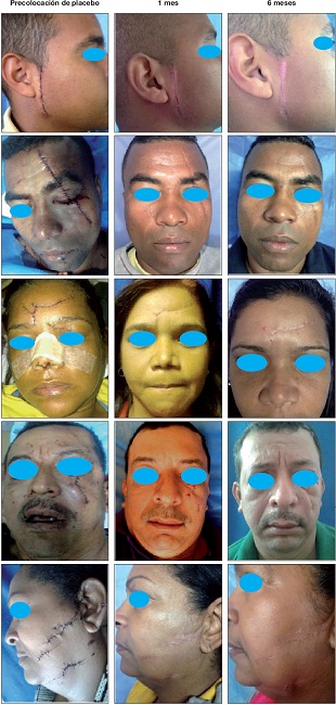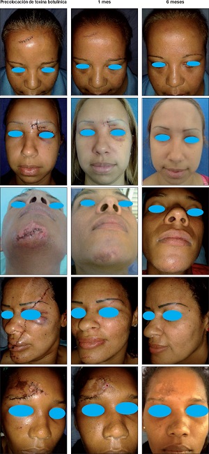 Conclusiones: La aplicación de toxina botulínica como tratamiento coadyuvante en heridas faciales postraumáticas, sobre todo en aquellos pacientes con fototipo de piel por encima de III, las heridas profundas, con dirección en contra de las líneas de tensión de la piel relajada, y en heridas frontales o centrofaciales, abre nuevos horizontes prometedores para favorecer resultados estéticos en cicatrices faciales postraumáticas.
