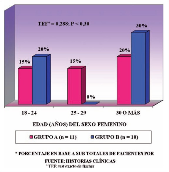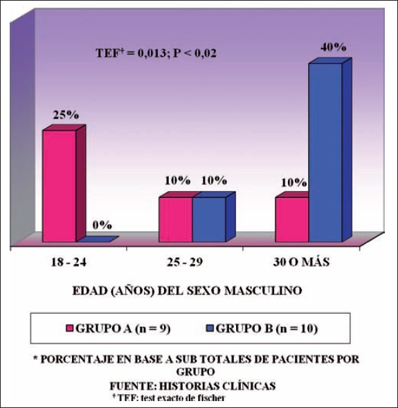 Al relacionar las categorías de edad con el sexo, encontramos que en el sexo femenino los grupos etarios en ambos grupos (A y B) fueron similares, resultando que no hallamos asociación significativa (p<0.30) entre la clasificación de las edades y los grupos correspondientes. Sin embargo, en el sexo masculino, pudimos observar que la mayoría de los pacientes en el grupo A estaban entre los 18 a 24 años, pero en el grupo B la mayoría de los pacientes se encontraban en el grupo etario de 30 años o más, lo cual muestra una diferencia estadísticamente significativa (p< 0.02) según el tipo de tratamiento recibido en el sexo masculino.