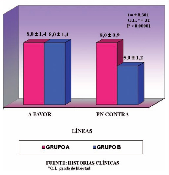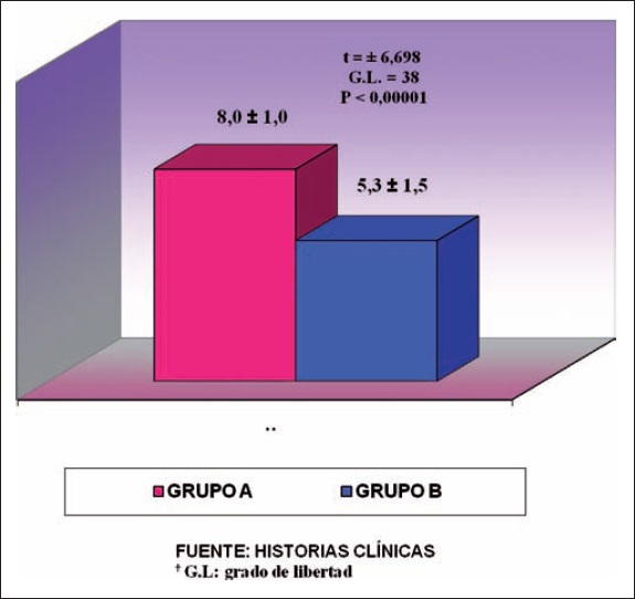 Al establecer la comparación de los promedios globales por grupo, determinamos una diferencia muy significativa (p < 0.00001) dado que la puntuación media fue superior en el grupo A, pues el valor medio fue de 8 y en el grupo B de 5.3. Si evaluamos la distribución estándar, en el grupo A los valores de cada paciente estuvieron más próximos al promedio ya que fue de 1 punto, es decir menor dispersión, que en el grupo B que dio un valor de 1.5 puntos de desviación estándar (Gráficos 1- 9).