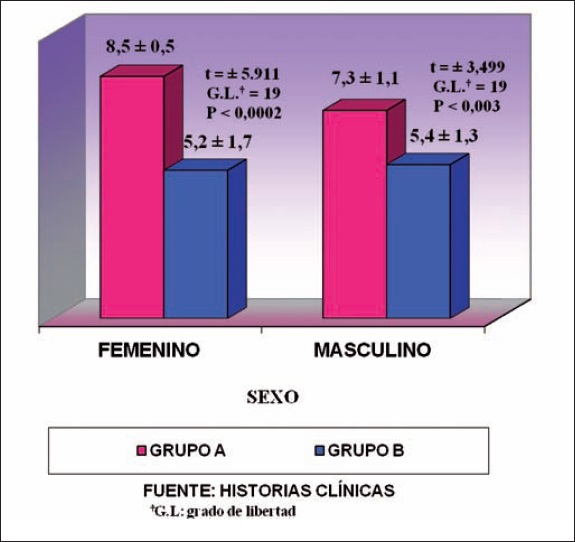 En cuanto a la distribución por sexo, el grupo A estuvo conformado por 11 pacientes de sexo femenino y 9 pacientes del sexo masculino, mientras que el grupo B estuvo conformado por 10 pacientes del sexo femenino y 10 pacientes del sexo masculino.