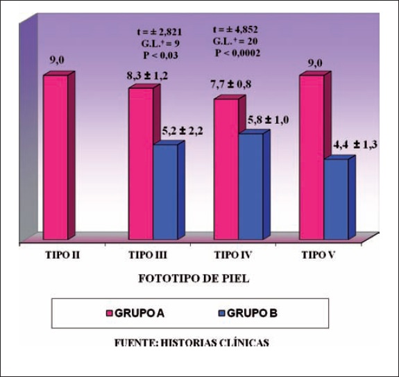 En las tablas IV y V se evidencia la relación de los resultados estéticos obtenidos por grupo (A o B) con las diferentes variables. En la tabla IV mos-tramos la relación de cada grupo con el sexo, fototipo de piel y las unidades estéticas afectadas; mientras que en la tabla V mostramos la relación con las variables de profundidad y las RSTL