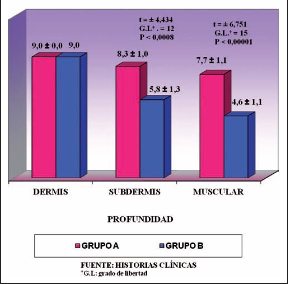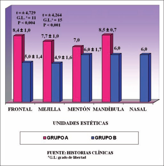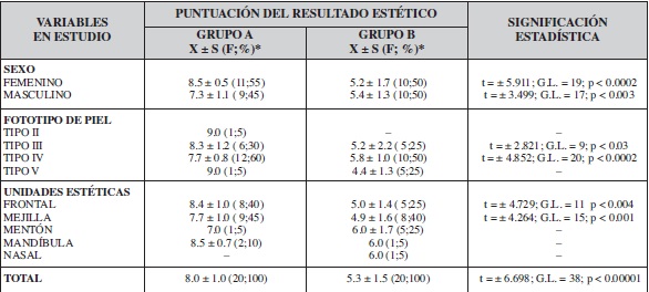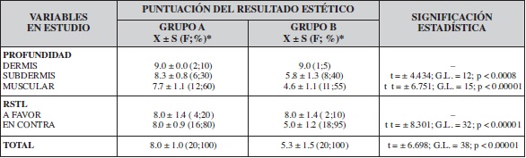 En el grupo A todos los valores promedios de la puntuación del resultado estético fueron superiores significati-vamente (p < 0.05) con respecto a los valores de la misma índole del grupo B en todas las variables en estudio a excepción de la variable dermis, en cuanto a la profundidad de la herida, pues en ambos grupos fue igual a 9 puntos, por lo que no evidenciamos una diferencia estadísticamente significativa. Igualmente, en la variable a favor de las RSTL tampoco obtuvimos una significancia estadística, pues el puntaje fue de 8 en ambos grupos. No obstante ocurrió que en algunas variables, como mentón y mandíbula como unidades estéticas afectadas, no obtuvimos significancia estadística; sin embargo, la puntuación de estas variables con respecto al resultado estético fue superior en el grupo A.
