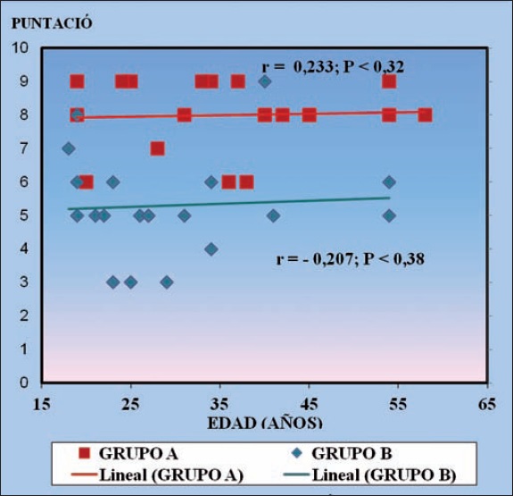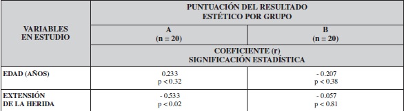 En la tabla VI mostramos los coeficientes de correlación (r) de la puntuación del resultado estético según edad y extensión de la herida, en donde ni en el grupo A ni en el B hubo correlación significativa (p > 0.05) entre la edad de los pacientes y la puntuación estética. Sin embargo, el signo del coeficiente fue positivo en el grupo A, indicando que a mayor edad hubo una mayor puntuación estética, mientras que en el grupo B a mayor edad hubo una menor puntuación estética.
