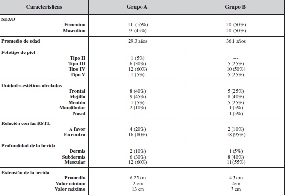 Resultados: La distribución por sexo presentó mínima diferencia entre los 2 grupos. El valor promedio de la puntuación del resultado estético fue superior significativamente (P < 0.05) en el grupo A con respecto al valor del grupo B. La cicatrización fue exitosa en el grupo A independientemente de variables como sexo y edad. Los fototipos de piel III y IV, la frente y mejillas, las heridas profundas y aquellas heridas en dirección desfavorable a las líneas de tensión de la piel relajada, mostraron diferencias significativas entre ambos grupos.