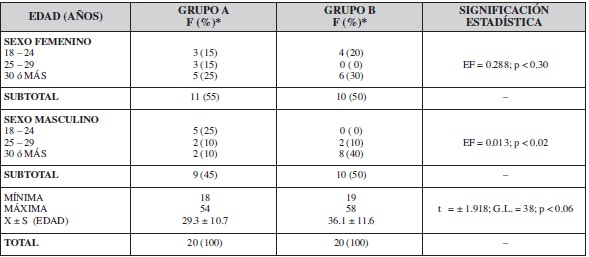 En la tabla II presentamos la distribución de la muestra según características demográficas y características de las heridas faciales estudiadas, En la tabla III mostramos la distribución de la muestra según edad y sexo. La media de edad para el grupo A fue de 29.3 años con una desviación estándar de 10.7 años; mientras que para el grupo B la media en edad fue de 36.1 años con una desviación estándar de 11.6 años; resultando no significativa (p > 0.06) la diferencia de 6.8 años entre los dos promedios. Con respecto a los valores mínimo y máximo de la edad de los pacientes, en el grupo A fueron respectivamente 18 y 54 años, mientras que en el grupo B fueron 19 y 58 años.