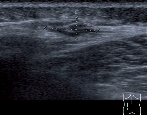 El estudio de imágenes mediante ecografía evidencia una lesión focal dependiente de partes blandas, de morfología fusiforme, no encapsulada y de márgenes irregulares, sin flujo en el eco doppler color (Fig. 1). La paciente fue referida a consultas externas de Cirugía General, donde le diagnosticaron quiste sebáceo.