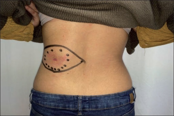 Se realizó extirpación local amplia y reconstrucción con malla biológica sin tensión y cierre por planos, ya que se han descrito hernias espontáneas y también secundarias a través del triángulo de Petit. Estas últimas, en su mayoría, son hernias postincisionales.
