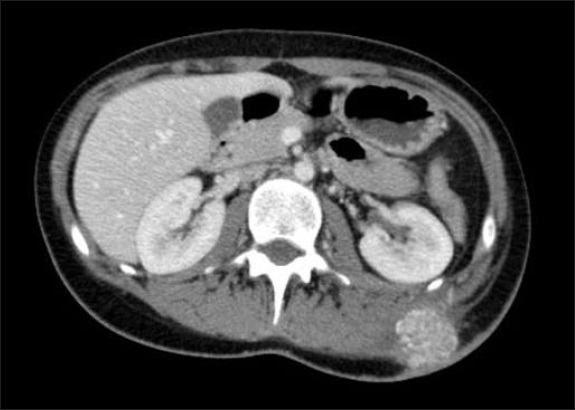 El estudio de imágenes con tomografía axial evidenció una lesión nodular, heterogénea, hipercaptante, de 3.5 x 3.2 cm, en la musculatura de pared abdominal póstero-lateral izquierda, observándose otra lesión nodular adyacente, caudal y lateral a la anterior, de 1 cm y que presentaba características similares. (Fig. 3).