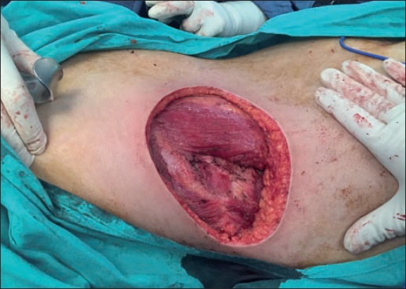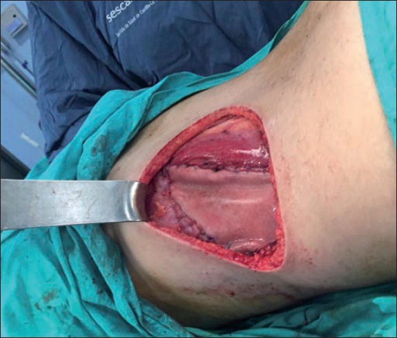 Debido a la posible naturaleza maligna de la tumoración decidimos su exéresis amplia. Bajo anestesia general realizamos un abordaje lumbar izquierdo oblícuo abarcando la cicatriz de la biopsia previa y extirpamos la lesión en bloque, incluyendo una elipse de piel de 8 x 14 cm, fascia muscular y parte de los músculos dorsal ancho, oblicuo externo y serrato póstero-inferior. Enviamos muestras del fondo de la lesión para su estudio histológico intraoperatorio, con un resultado no concluyente en profundidad y en el borde muscular superior, por lo que procedimos a ampliar la resección en el suelo del triángulo o músculo oblicuo interno y en el dorsal ancho y oblicuo externo (Fig. 4).