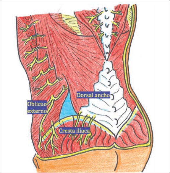Quirúrgicamente, la región lumbar está definida como el área entre el borde inferior de la costilla duodécima superiormente, la cresta iliaca inferiormente, el músculo erector de la espina medialmente y el músculo oblicuo externo lateralmente.(3) El triángulo de Petit es un espacio triangular en la región lumbar cuyos límites son: el borde posterior del músculo oblicuo externo lateralmente, el borde anterior del músculo dorsal ancho medialmente y la cresta ilíaca inferiormente, la cual forma la base del triángulo. Su techo es la fascia superficial y su suelo es el músculo oblicuo interno.(3) (Fig. 7). Los límites del triángulo inferior coinciden con la zona de la extirpación en nuestra paciente, a cuyos bordes fijamos la malla. Nuestro objetivo era prevenir la aparición de una hernia a través de este triángulo anatómico.