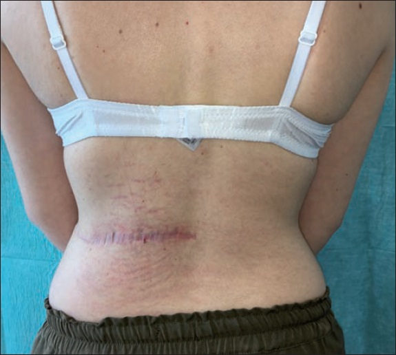 La recuperación de la paciente fue satisfactoria, con alta hospitalaria precoz a los 2 días de postoperatorio. Mantuvimos el drenaje durante 15 días con profilaxis antibiótica vía oral y revisiones en consulta externa una vez por semana el primer mes y luego a los 3 y 6 meses, con una evolución satisfactoria de la herida, sin secuelas funcionales, evidencia de debilidad en la región lumbar o recidiva local del tumor.