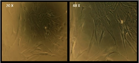 1. Obtención de células madre mesenquimales. En la Figura 1 presentamos las micrografías correspondientes a las células madre mesenquimales derivadas de la gelatina de Wharton; se caracterizan por presentar una morfología fibroblastoide, aspecto fusiforme y abundante citoplasma.(6,7)