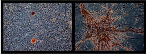 2. Diferenciación de células madre mesenquimales. Tras la obtención de cultivos de células madre mesenquimales, se estableció un subcultivo tal y como hemos explicado en la sección de Material y Método. En la Figura 2 mostramos la micrografía obtenida de los cultivos tratados con la tinción de rojo de alizarina, reactivo que se enlaza con las moléculas de calcio depositado en la matriz extracelular que previamente ha formado el cultivo.