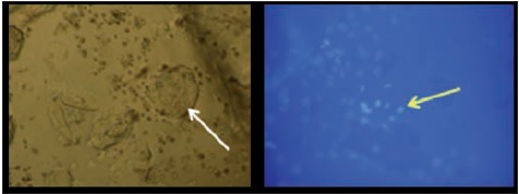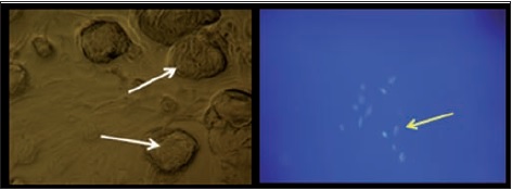 A fin de corroborar la adhesión de las mismas sobre la membrana, realizamos el marcaje con DAPI (Fig. 5B), lo que permitió observar los núcleos celulares y la distribución de las células que se habían adherido a la superficie de las membranas de quitosano, encontrando que las células mantenían una distribución de colonias similar a la observada en los controles. Así mismo, y mediante microscopia óptica convencional, fue posible observar estructuras tipo “bolsillo” sobre las membranas, donde las células parecen distribuirse de forma más concentrada, formando colonias (Fig. 5).