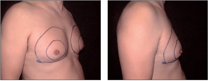 En todos los casos, realizamos la marcación prequirúrgica con el paciente en bipedestación, delimitando el área pectoral tanto en la porción superior como en la lateral, definiendo así los límites de la liposucción. Marcamos también los puertos de entrada para las cánulas sobre la línea axilar anterior de forma bilateral, y el puerto de entrada a nivel axilar (Fig. 3). En 15 de los 17 pacientes del grupo 2 (a quienes se les practicó USAL mas cirugía abierta), realizamos marcación periareolar inferior para abordaje mínimo de resección abierta de glándula mamaria. Los 2 casos restantes correspondieron a los pacientes con ginecomastia severa por tratamiento con antiandrógenos, a quienes les realizamos marcación para abordaje por surco submamario con la finalidad de lograr acceso completo al tejido glandular.