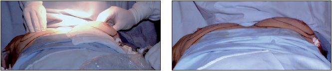 Procedimos a continuación al uso del ultrasonido quirúrgico con un equipo VASER® (Sound Surgical Technologies, Colorado, EE.UU.) entrando a través de los puertos marcados y empleando una frecuencia de 36.000 Hz, con calibración de potencia al 70% y con sonda de titanio de 2 anillos de 3.7 mm (provistas por el fabricante). Previa colocación de medidas de protección cutánea (compresas húmedas estériles) realizamos barrido en forma de abanico durante 10 minutos en cada mama.