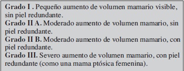 La clasificación más utilizada es la descrita por Simon en 1973, según el tamaño y la redundancia de piel (Tabla I).(2) Se considera que el tratamiento con técnicas de lipoaspiración está indicado para los grados I y IIa y la resección mixta para los grados mayores.